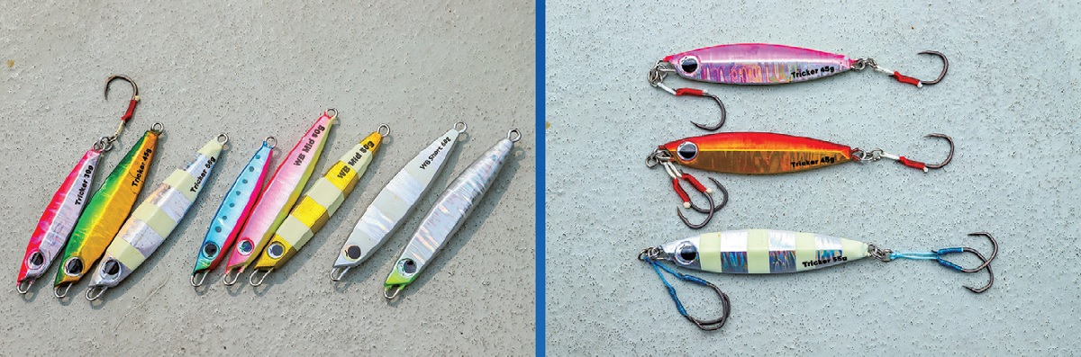 ▲ジグは、マダイ狙いでは今回も「トリッカー2」を主に使用した。とりわけ横方向の攻略に強い。根魚狙いでは定番の「ウィークベイト」MIDとショートをメインで。ドロッパーのダウンサイズ版もテスト中だ。状況に応じてフックのセッティングも変更。一本二本の違いが釣果を大きく左右する。