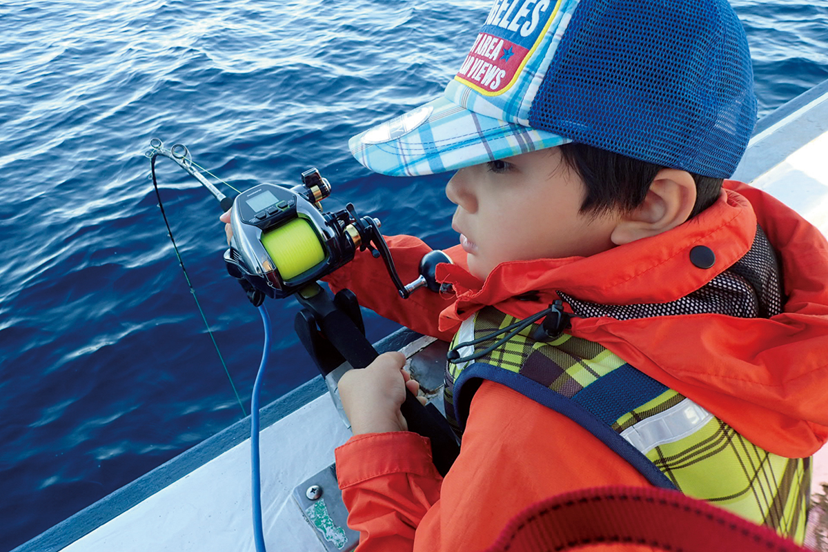▲小学1年生のショウ君は電動リールを使用。真帆さんとパパさんに挟まれて釣りを開始。