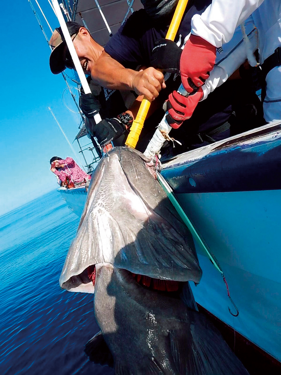 アブラボウズの入れ食い状態だが、佐野の時間をかけた慎重なやり取りは、見るからに大型らしい。小一時間ほどして浮き上がったのが、それは見応えのある80㎏は超えるだろう素晴らしい魚体だ。