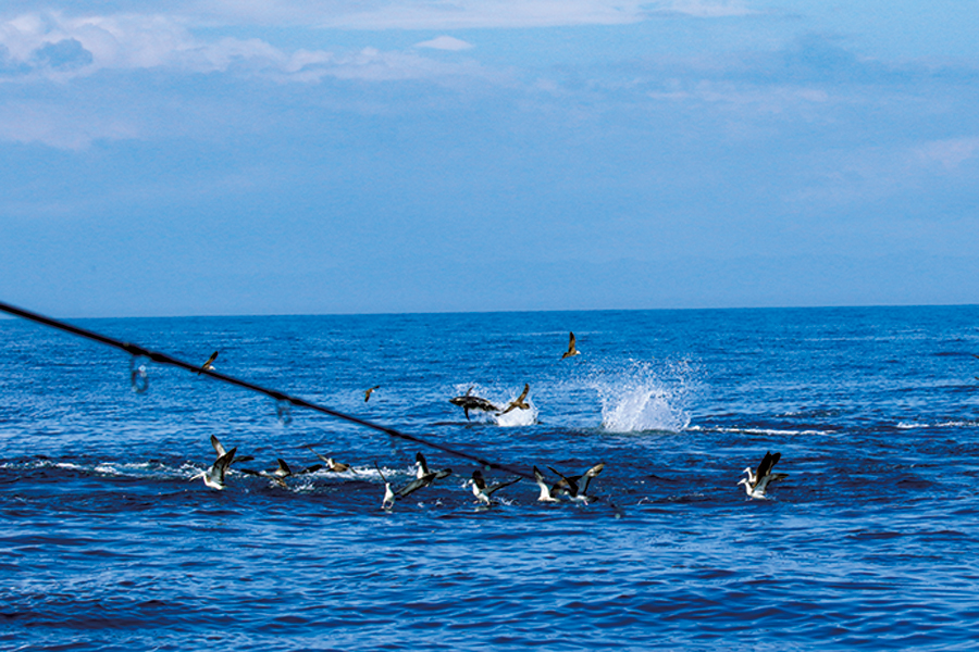 「釣る人は、鳥の動きをよく見ています」と味澤船長が言うだけあって、キハダゲームでは、鳥がいろんなことを教えてくれる。だから、釣る人にキハダを探す移動中に寝ている人はいない。
