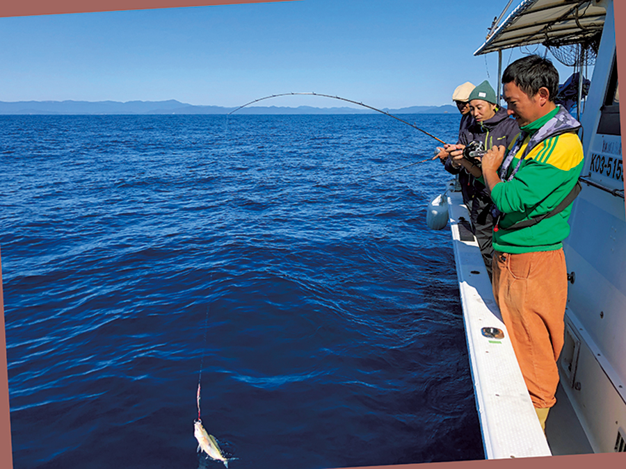少し潮の効いたポイントにジグを落とせば、着底を待たずスマが続々とヒット。黒澤さんも小気味よくタックルを操りスマを仕留めた。やや小ぶりだがお灸(ヤイト)の痕もしっかりあり、今晩のお刺身確定となった。