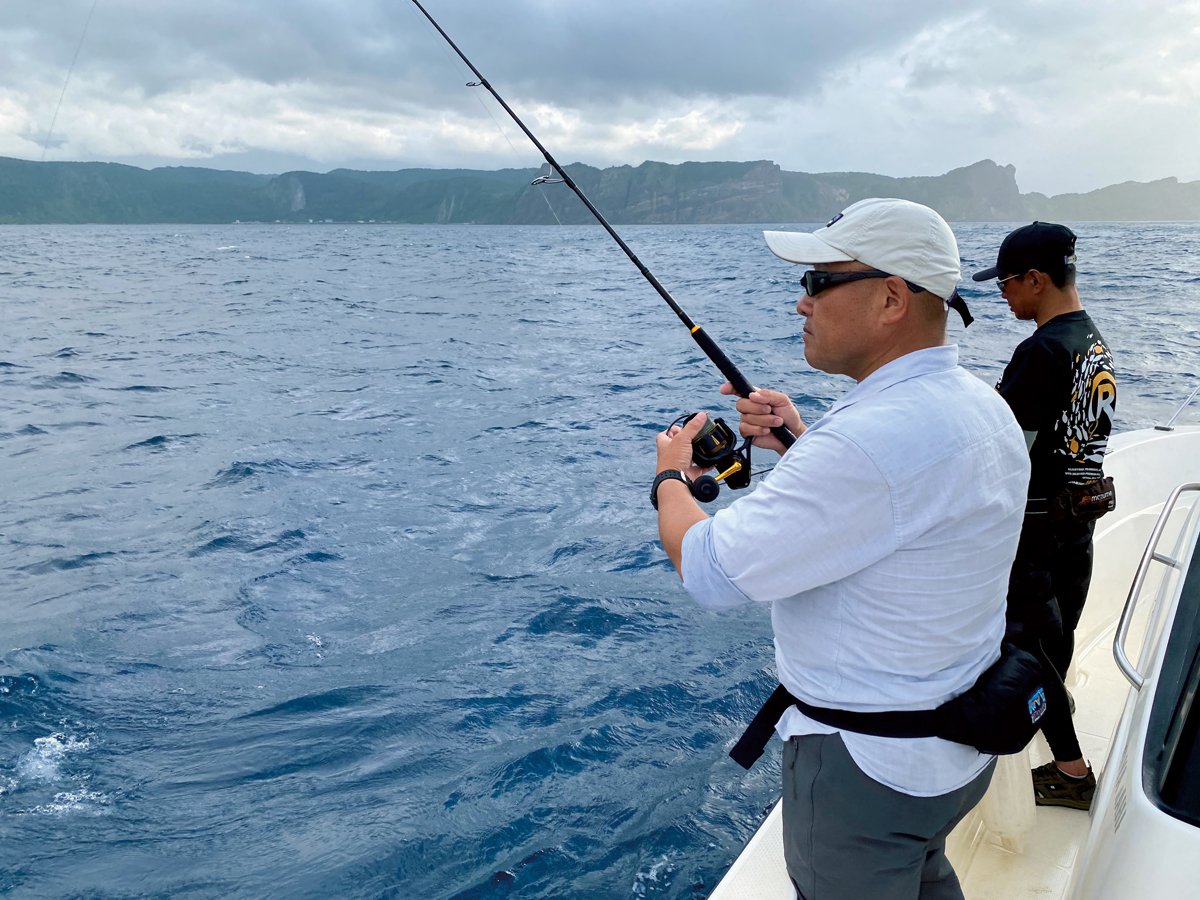 ▲ブリからのファーストコンタクトは佐藤さんに来た。船がシーアンカーの動きに馴染んですぐのヒットに釣りの上手さを感じる。そしてすぐに私にもヒット。水深は50m、徹底したボトムコンタクトでリフト&フォールを繰り返した。