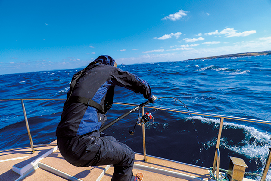 ▲25.5kgのヒラマサとのファイトシーン。水深は10m。ドラグは15㎏に設定。全身を使ってその重量感あるファイトに耐える。