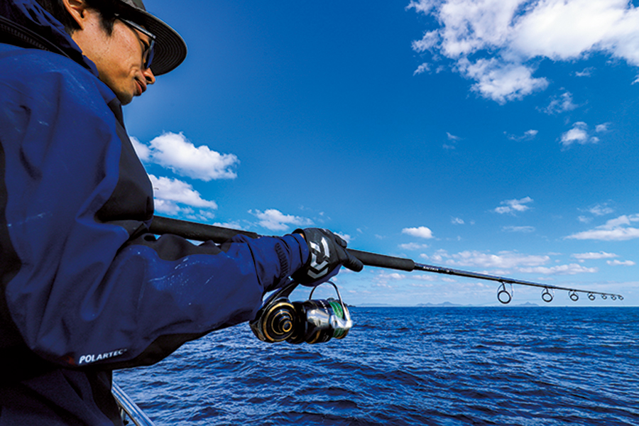 富樫が使うロッドは自身が設計したソルティガAPのニューモデル(プロト)。富樫はかなりの負荷を掛けているのにもかかわらず、とてもマルチピースのロッドには見えない美しい曲がりとパワーである。言われなければ、とても3本継ぎのロッドには見えないだろう。