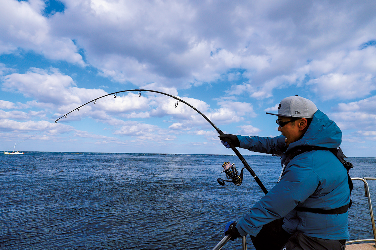 ▲水深15mの浅根でヒットさせ、マルチピースの「ソルティガAP」を思いっきり曲げる富樫。ファイトタイム2分で上がって来たのは22㎏だった。