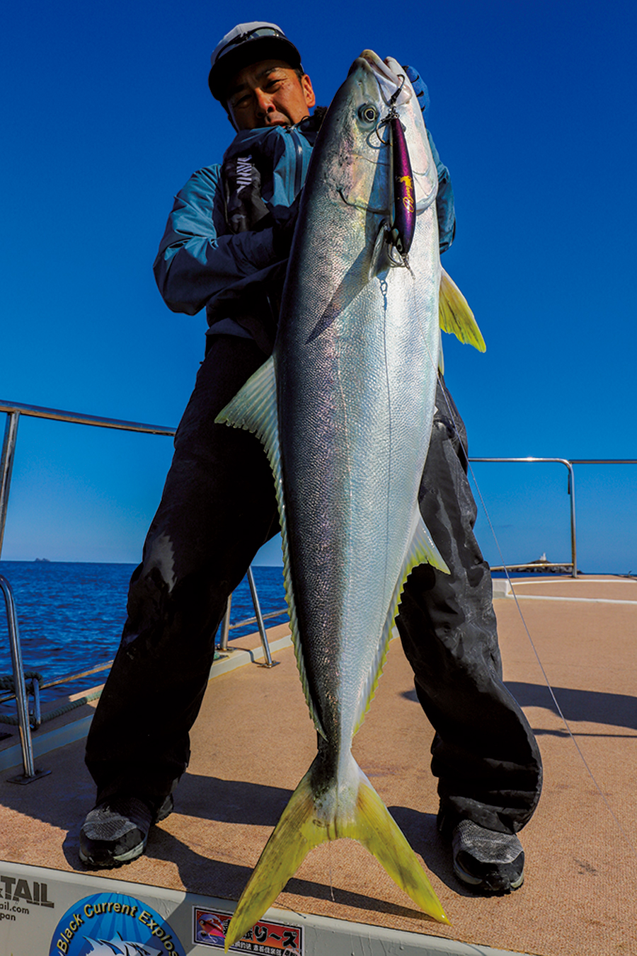 ふた流し目。佐野はきっちりと船が流れるスピードを読んでキャストのタイミングを計り、絶好の瞬間にプラグをキャスト。10号ラインが綺麗な放物線を描いて湧き立つ渦の中にプラグが着水する。すかさずアクションさせると、巨大な水飛沫と共に巨体がもんどり打って出た。またまたデカイ。先ほどまでの魚とはひと回りもふた回りも違う。間違いなく30㎏オーバーだ。