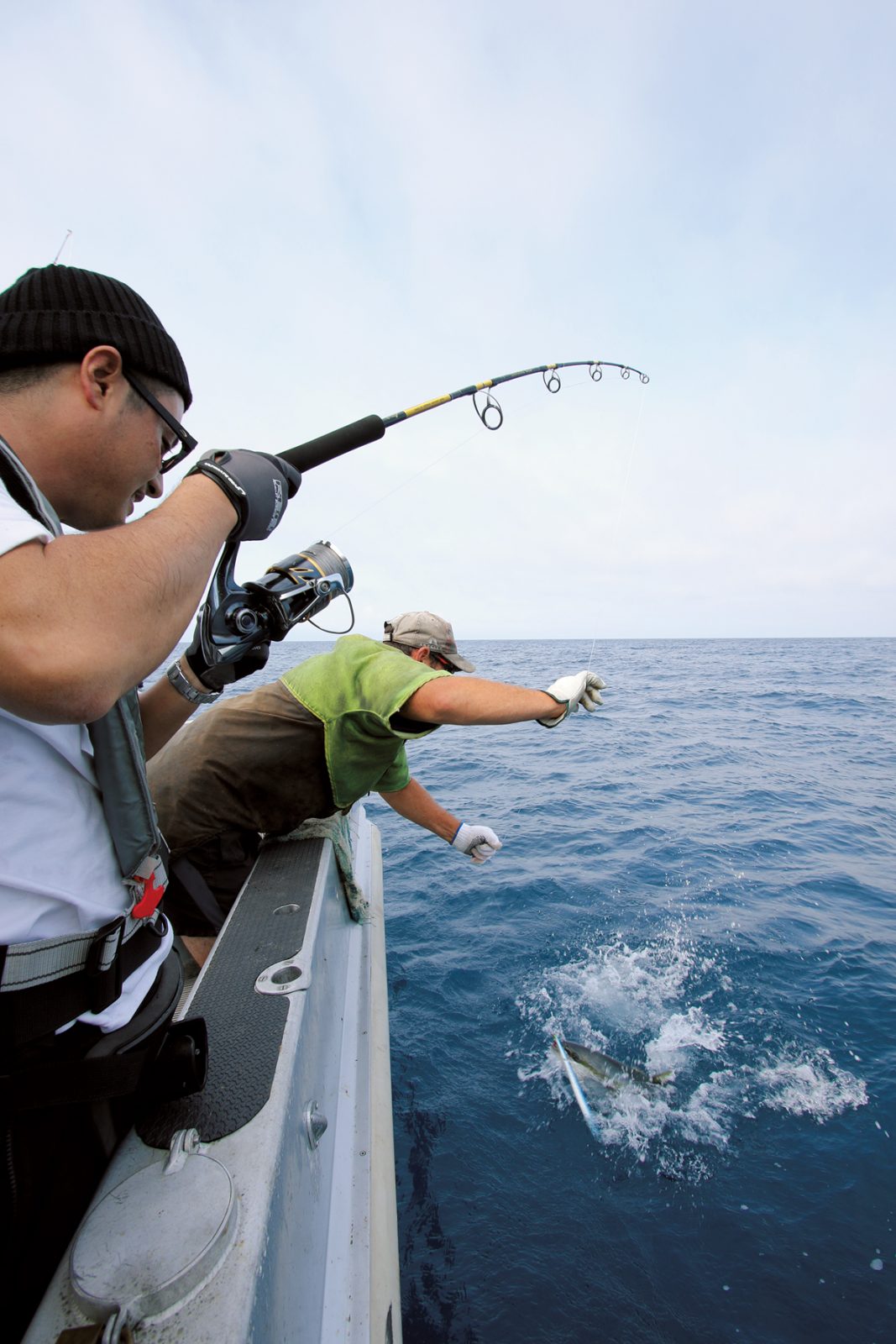 ▲船べりまで寄せたキングフィッシュは、大型でなければ船べりでリリースとなる。