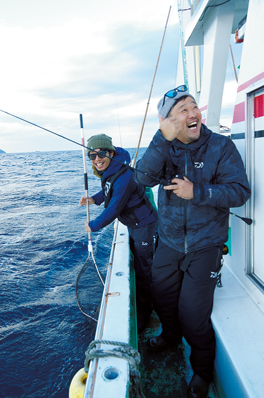 釣りを開始する前、この日のプランをそんな風に話していたスロージギングの名手・清水一成さん。爆風で船が大きく揺れるなか、頭に描くターゲットはもちろんアカムツだ。だが開始早々、とんでもない魚が清水さんのジグにアタックしてきた。