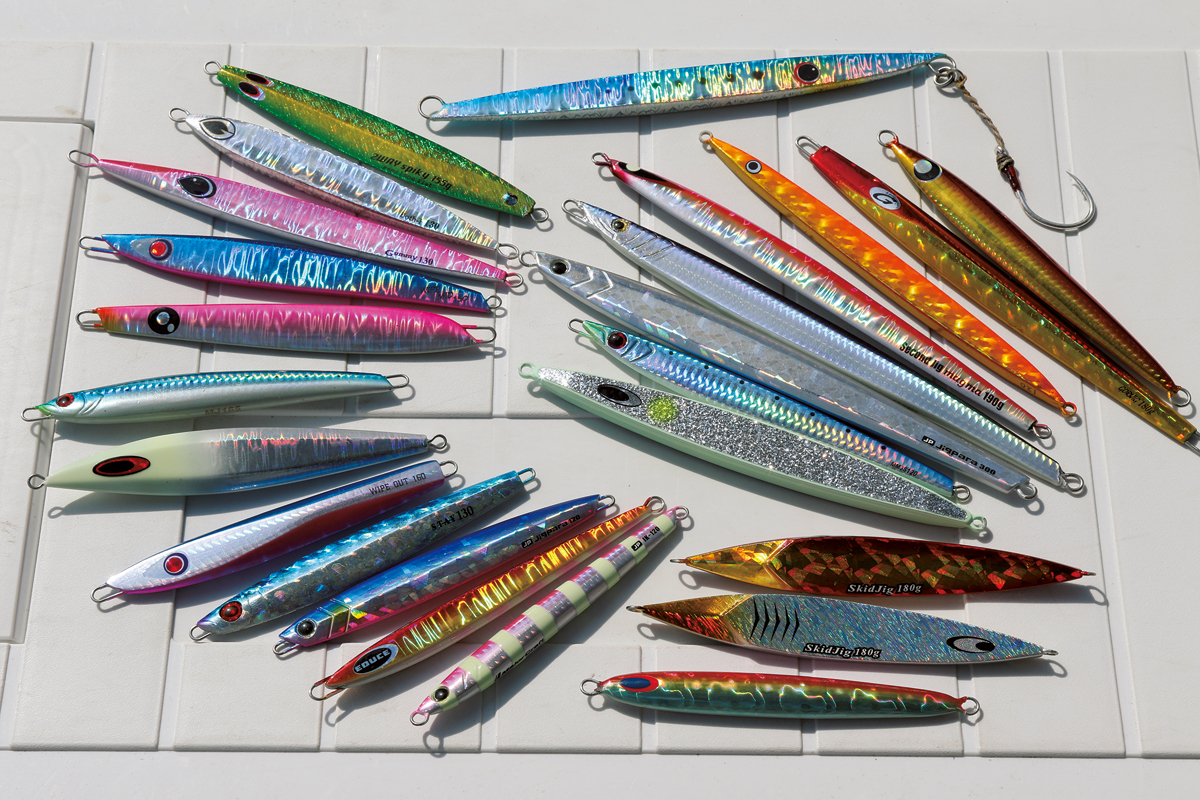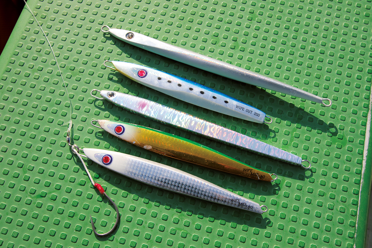 ▲タチウオパターンのようにメインベイトがはっきりしている場合は形も色も絞り込みやすい。そうでない場合はレンジに届くウエイトと形状を選び、色も水色や時間帯でシルバー系、ゴールド系、グロー系と使い分ける。