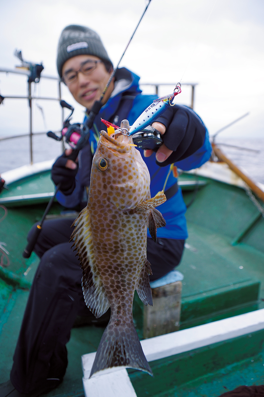 結果はすぐに出て、35㎝ほどのアオハタを筆頭に数匹の根魚を立て続けにゲット。竿をぐいぐい引き込む小気味よい引きの連続に、思わず笑顔がこぼれる。その後再びベイトタックルに戻すと、珍しい小型のホウキハタがヒットしてきた。