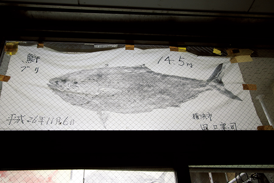 ▲鴨下丸の受付に貼ってあるブリの魚拓。こんなサイズがいるのだ。