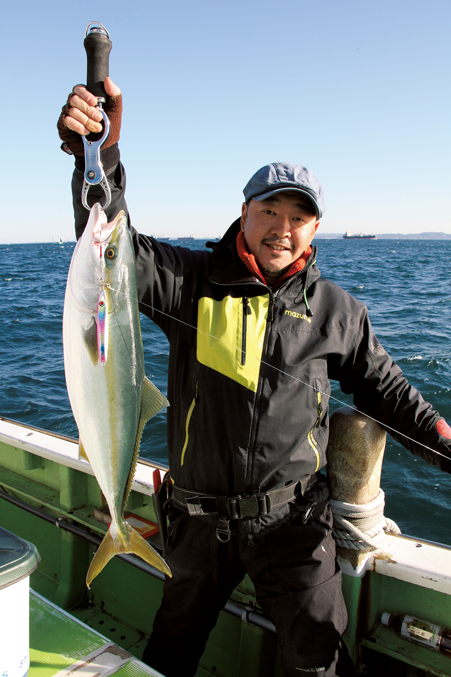 ワラサをバーチカルで探る場合、しゃくりの基本はワンピッチジャーク。テンポよくしゃくり、時折ストップなどを織り交ぜて捕食の間をつくってやる。東京湾口の場合、タンカーなど大型船の通り道であり、それらの船による船の上下もあるので、その上下も計算しながら、テンポよく探っていく。