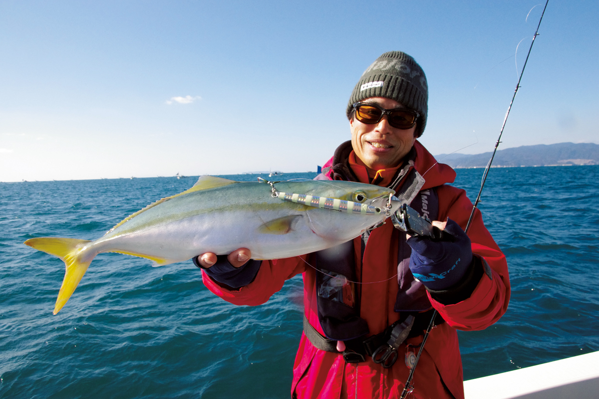 ▲ジグパラバーチカルイカナゴにヒットしたハマチ。ジグウエイトは100~150gが標準。フックはZOCのシングル、タンデム、デュアルの2/0、3/0、4/0を適宜選択。