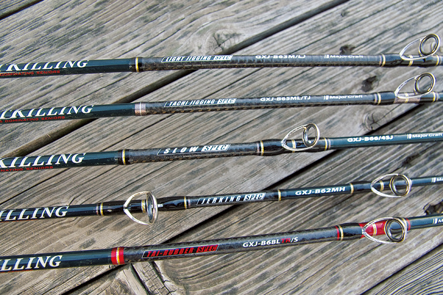 ▲ロッドはジャイアントキリングがおススメ。4軸カーボンとクロスフォースで武装したブランクスは操作性、感度、パワーを兼備。気軽かつ本格的にジギングを楽しむことができる。カテゴリー別に専用スペックを展開しており、ブリジギングにはジャーキングスペック、ライトジギングスペック、スロージギングスペック、マイクロジギングスペックを使い分けている。