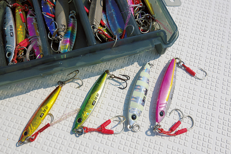▲ジグはジグパラTG(タングステン)の40~60gを主に使用。40g以上のモデルはフロントダブルフック仕様のため、必要に応じてジグパラアシストフック等をリアにセットしている。