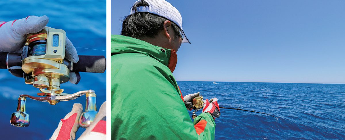 この日はさらに状況は厳しかった。終始潮がまったく流れない。それでも永井は、なんとか本命を一尾キャッチする。水深48mで、ベイトタックル&トリッカーII45gという組み合わせ。140mほどラインを出し、着底から50m巻いたときだったという。ボトムからおおよそ30m上の計算だ。