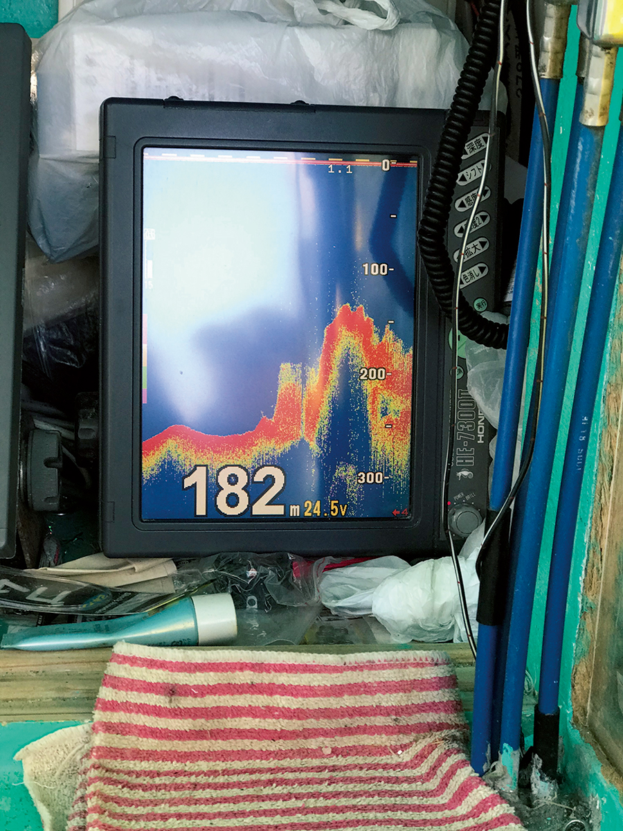 その後、4月24日に、亜由丸船長と2人だけで再び沖に出た。ポイントは、やはり八重根港沖の「エイシン山」と「カミナリ山」だ。潮流は緩く「カミナリ山」では潮が全く動かず、ラインの撓みすらなく真下に落ちていく。昼過ぎまでは、小魚1尾も触れる感覚がなかった。