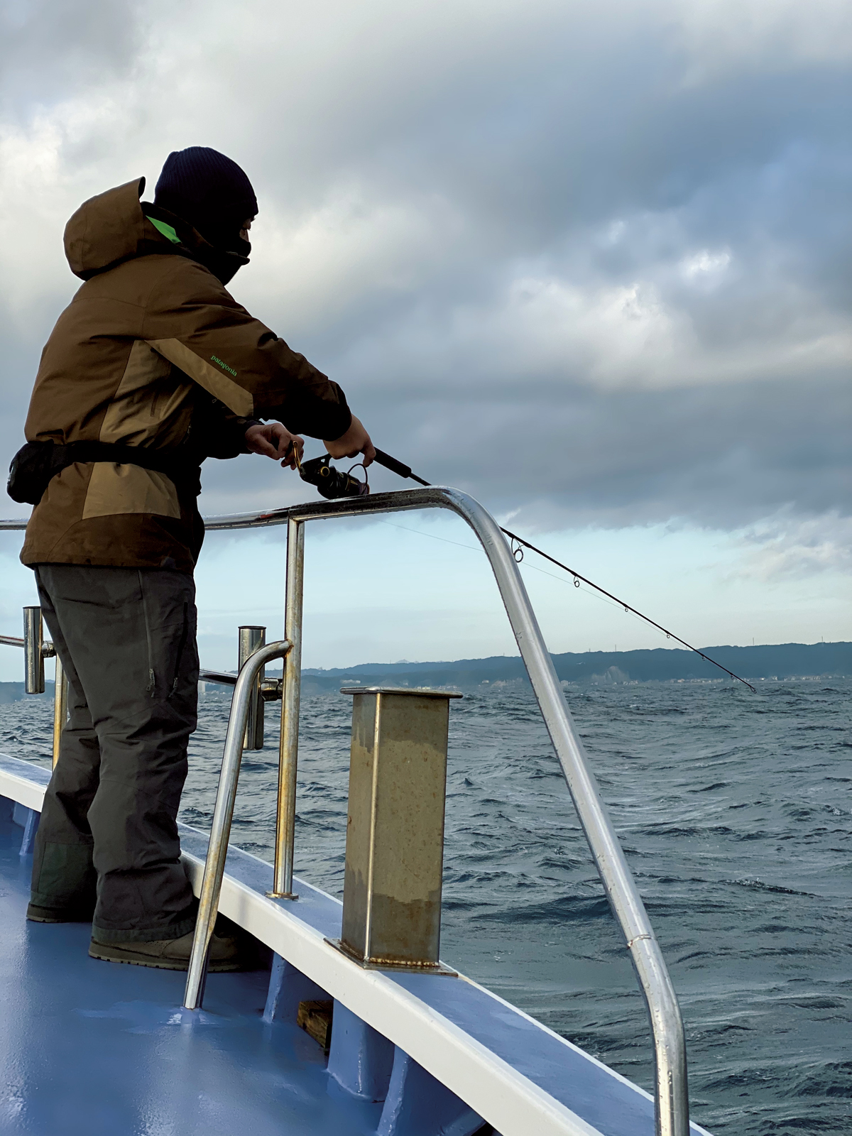 「水深16m。ポツポツした反応の中に、たまに大きな反応が映ります」と田村船長がアナウンスをくれる。水中の状況を頭で組み立て、ジグを柔らかく動かしながら探るのだが、全てイナダからのバイト。緊張と落胆が交互に続く。