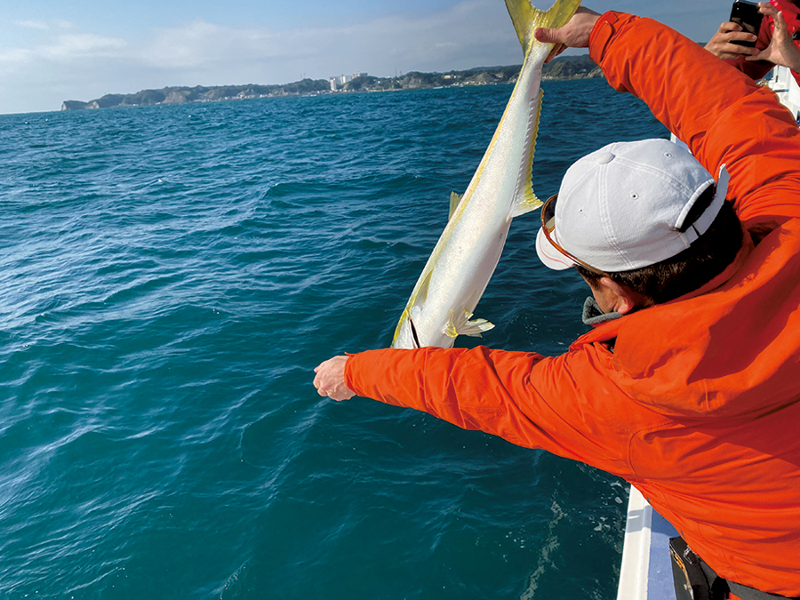通い続けるアングラーの術に脱帽となった。このタイミングでベイトサイズに合わせてCBONEのC1セミロングの110gに、動きも意識して交換していた。完璧に釣り勝っていた。やはりフィールドに精通している人は違う。週イチで通うスタイルは、何ら美容師さんや花上青年と変わらない。しかし週イチでも状況判断をわきまえて、瞬時に対応していくことは、ローカルアングラーだからこそ読め、適正な判断ができる。10㎏クラスのヒラマサを添田さんは御宿沖にリリースし、次への釣果につなげてくれた。
