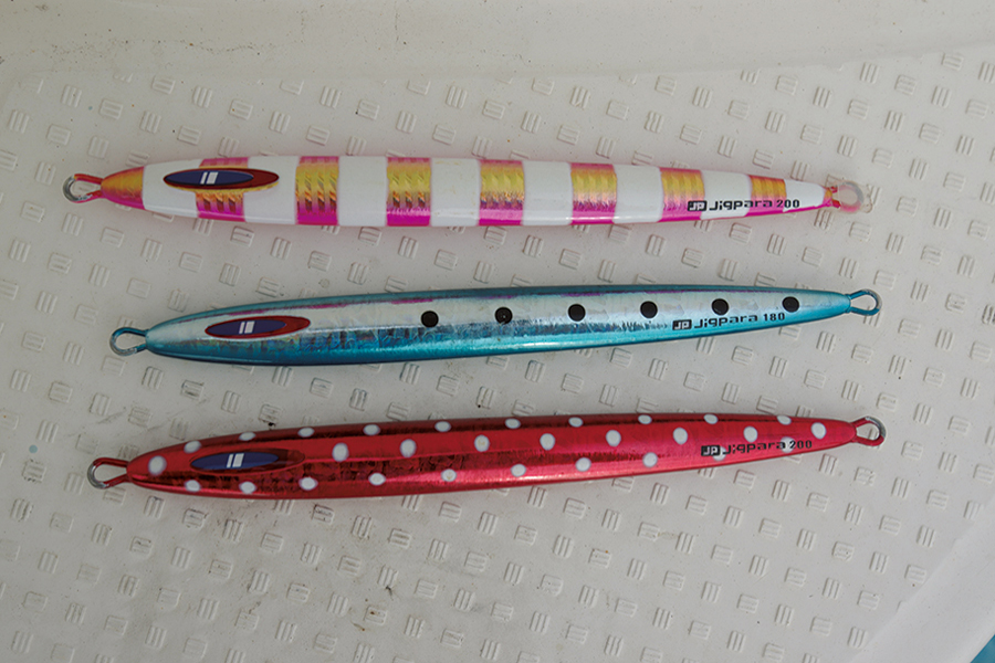 ▲メタルジグは形もサイズタチウオを再現。ヒロセマンが多用するのはジグパラバーチカル ロングと、同ロングスロー。200g前後のサイズで、カラーはシルバー系を選んでおけば間違いない。