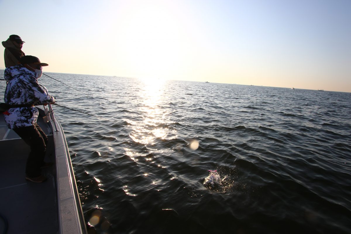 2人は素早く準備を済ませ、朝一の魚の活性の高い良い時間帯を逃さないようにと船長に出船のOKを出し、ポイントへと急いだ。