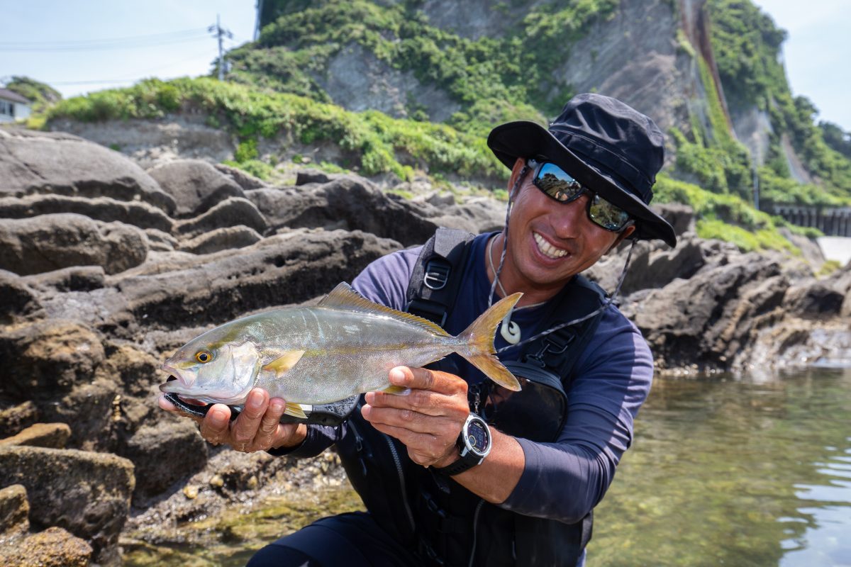 どういうわけか海には広範囲に濁りが入っていた。折本さんも「何でだろう?」と首を傾げる。自然相手の釣りではままならないことが起きるのは日常茶飯事。サーフでの釣りを諦め、磯場に移動、回遊魚やハタ類に狙いにチェンジすることにした。