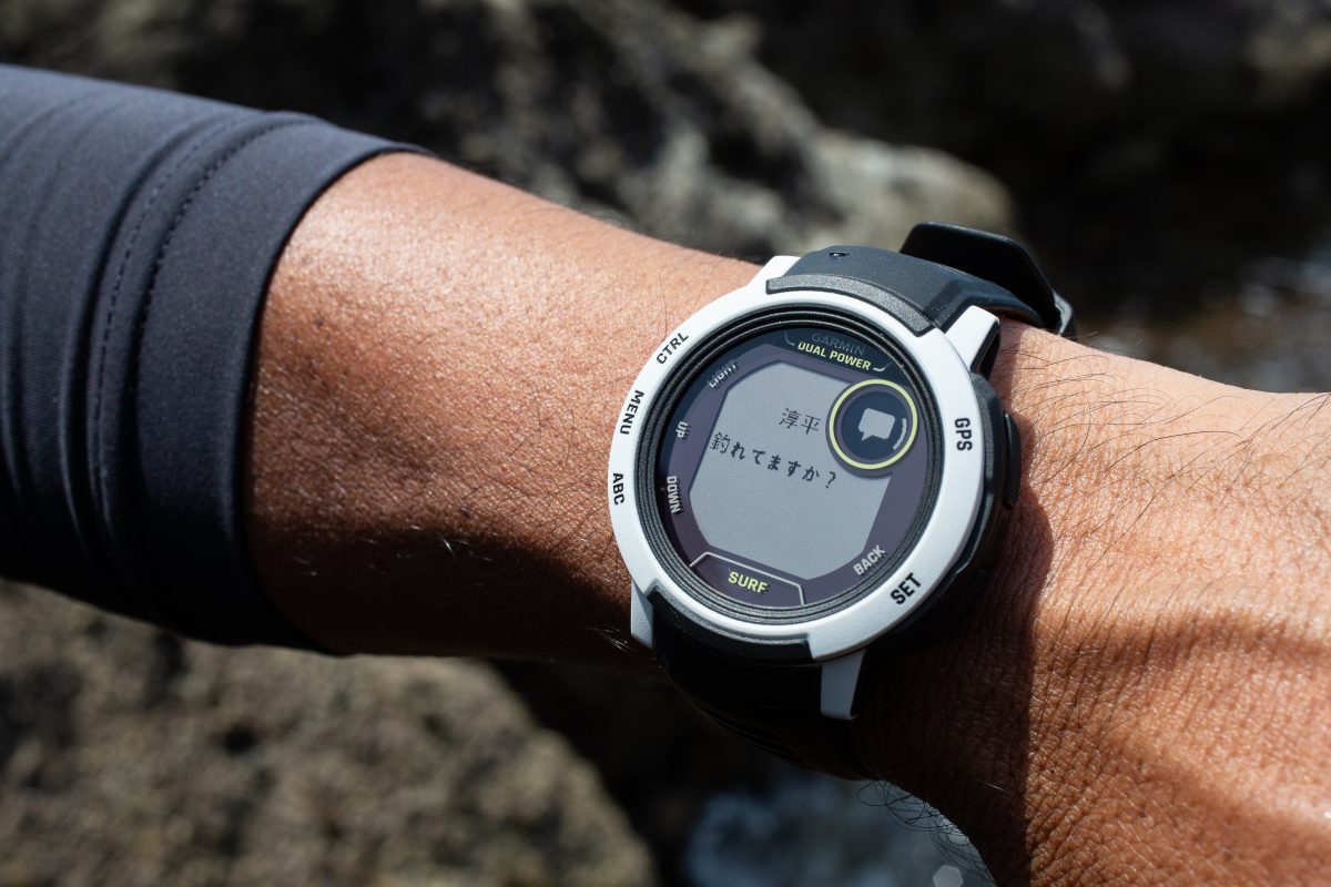 Instinct 2 Dual Powerは、スマートフォンなどのモバイル端末とペアリングすれば、さまざまな通知機能を利用可能。たとえばLINE。釣りの最中やロケの最中は通話はしにくいもの。スマートフォンとペアリングしたInstinct 2 Dual Power Surf Editionには、LINEをはじめとした各種の通知を表示可能。余裕ができたときにスマホでコールバックするなど、素早い対応が可能だ。