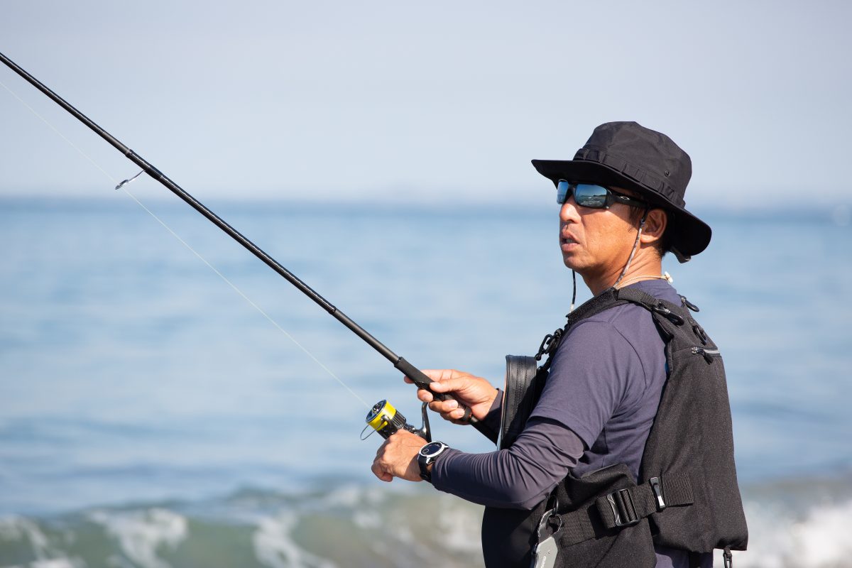 魚が釣れる以前に自身の危険回避という意味でもリアルタイムで潮汐の情報を得ることができるのはとても重要。気軽なショアフィッシングであっても海を侮ってはいけない、ということだ。移動を繰り返しながらサーフでキャストを続けた折本さん。熱中症警戒アラートが発せられる酷暑のなか、1匹を求める釣りが続いた。