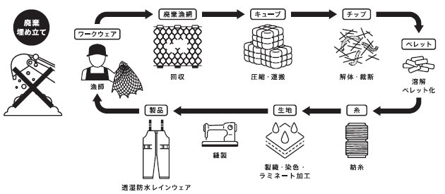 フィッシングタックルをグローバルに展開するDAIWAが「地球を想い、世界中の仲間と豊かな自然を未来へつなぐ」ことを目指し、2022年3月にスタート。本プロジェクトは廃棄漁網を糸へと再生し、ウエア等へアップサイクルするプロジェクトです。