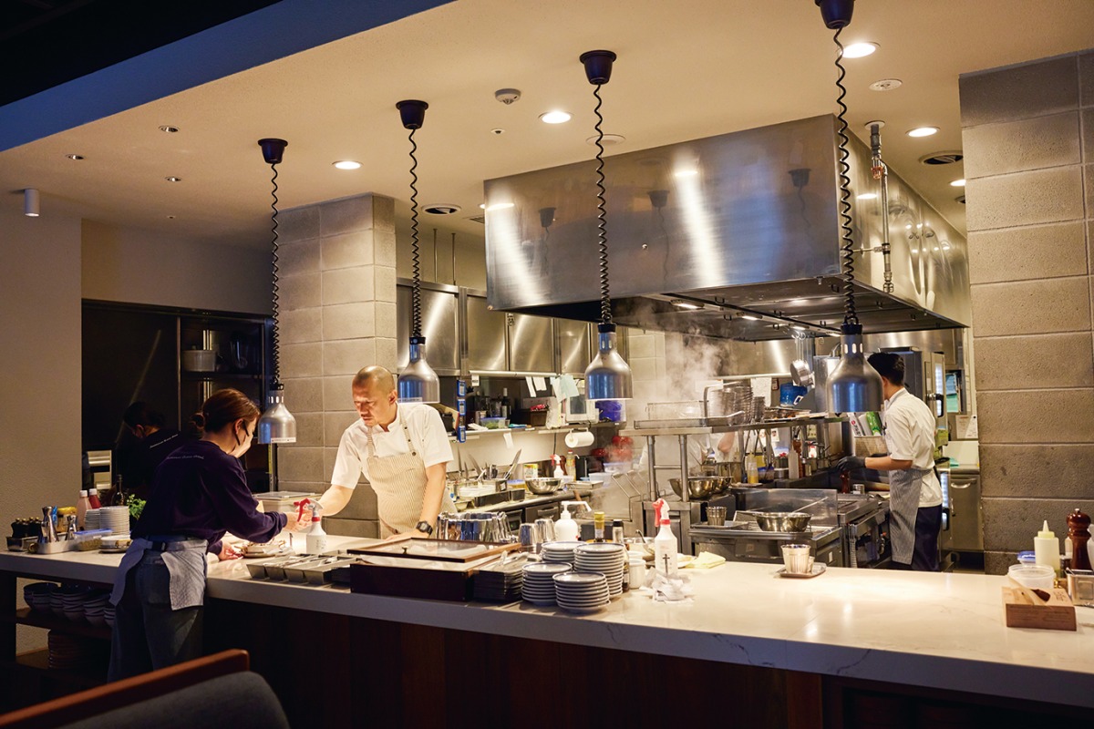 屋外のテラス席と、バーカウンター、オープンキッチンが広がる賑やかな屋内席。アペタイザーから、イタリアンテイストのメイン料理、パスタまで、幅広いメニューが揃う。スペシャリテである牡蠣は、その時々で最も美味しい地域からシェフが厳選して仕入れる。
