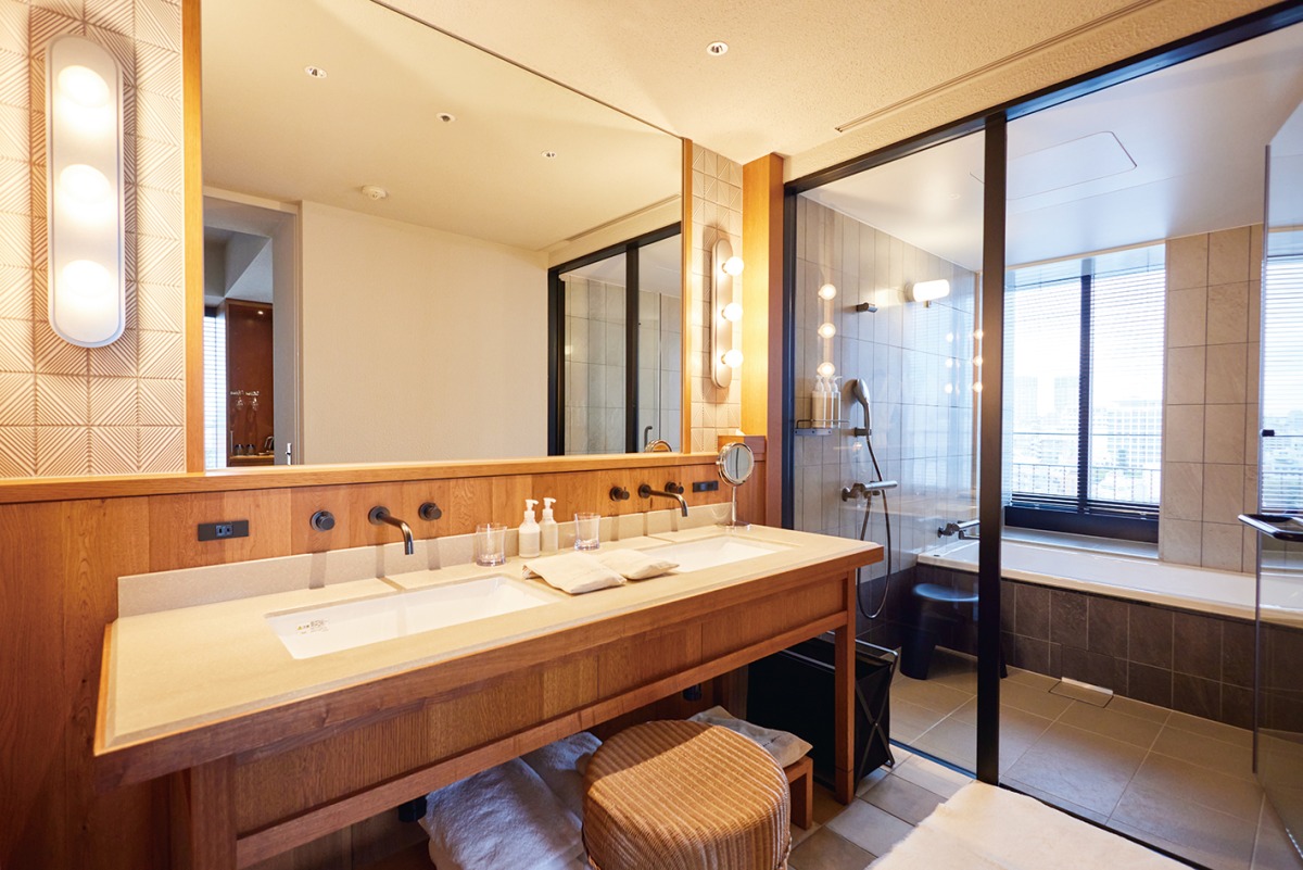 ミッドセンチュリー時代のアメリカンカルチャーから着想を得た内装デザインとインテリア。客室は5タイプ全88室。スタンダードな部屋でも45平米以上の広さがあり、ゆったりとした間取りが特徴。大きな窓からは那覇市街地のパノラマが広がる。ドレッサーやバスルームまで統一された世界観が、非日常の旅時間をより贅沢な時間に。