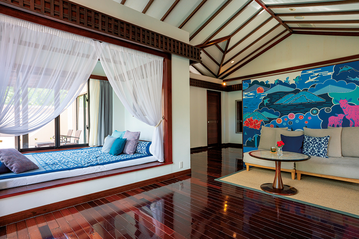 広大な敷地に点在する60室のヴィラタイプの客室はオールスイート。小浜島との出会いを表現した鮮やかなグラフィックウォールが室内に設置される。島でのんびり過ごす山羊や海中を優雅に泳ぐマンタ、小浜島中央にそびえる「大岳(うぶだき)」が描かれ、旅の期待感を掻き立ててくれる。