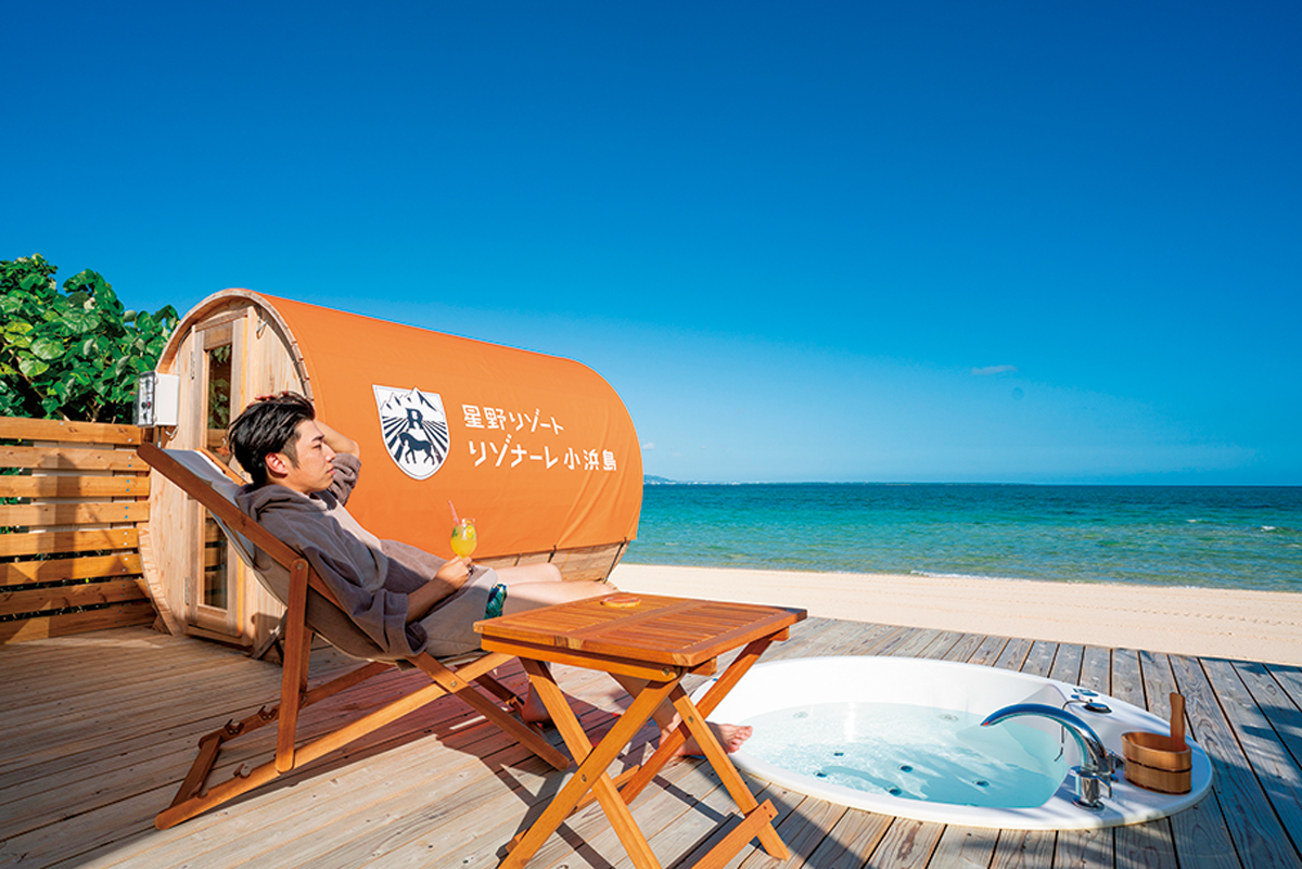 美しい海を目の前にととのう「絶景海風(うみかじ) サウナ」。国内最大の珊瑚礁「石西礁湖」が広がる絶景を眺めながら、海風でととのう体験ができる。冷水浴や外気浴を行うウッドデッキスペースでは、シークワーサーの特性モクテルで水分補給。ここにしかないサウナを満喫できる。