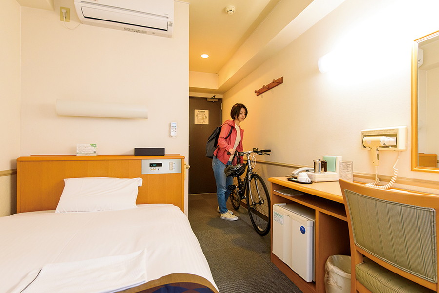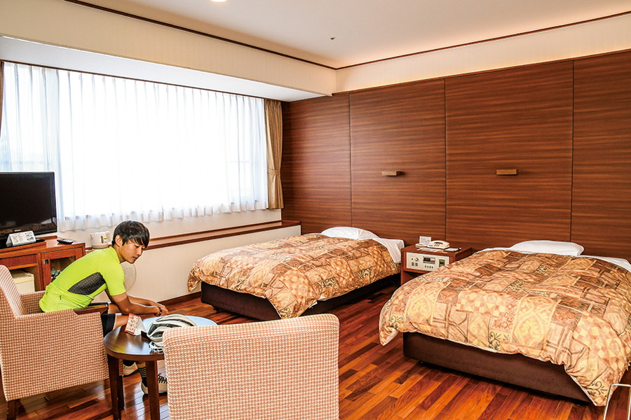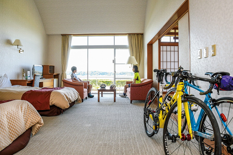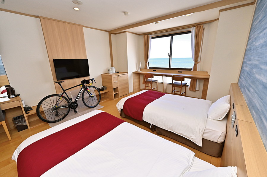 ゆったりくつろげる広い客室には全室バス・トイレ完備。自転車はロビーで保管可。サイクリストにはミネラルウォーターをサービス。