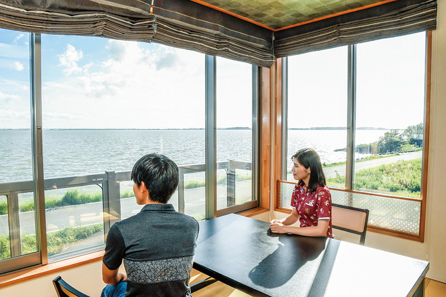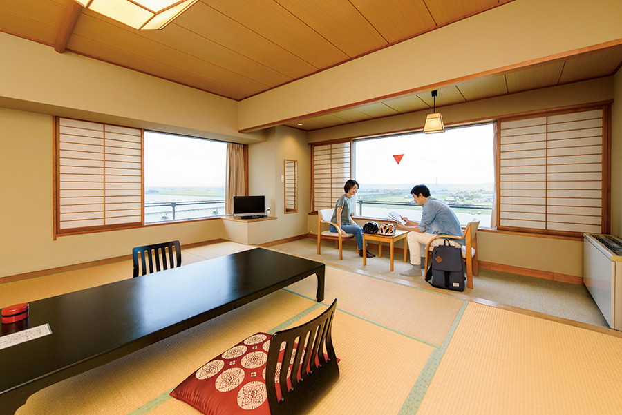 袋田の滝そばにある和モダンの宿。予約時に伝えておくと客室にバイクラックを設置しておいてくれ、広縁には掘りごたつもある。