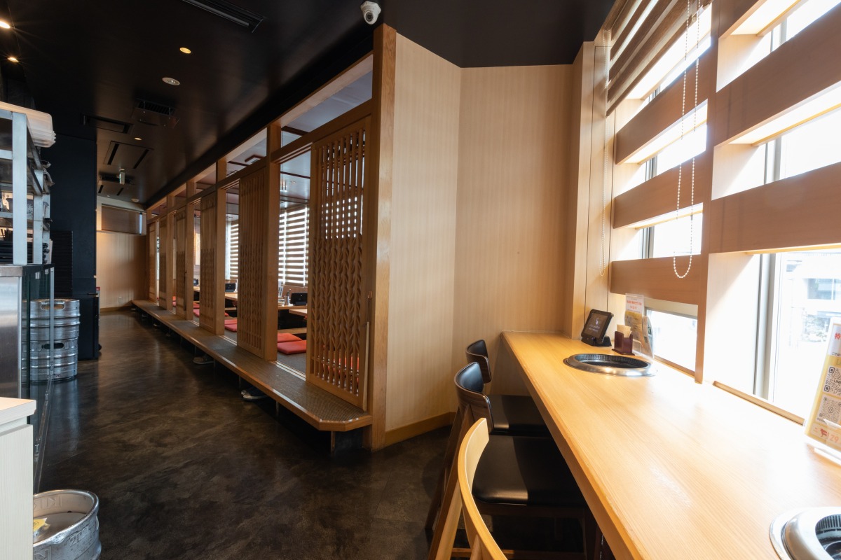 店内はお座敷とテーブル、個室におひとり様にも好評というカウンター席を用意。眼下に知らない街の人やクルマを眺めながらいただく焼肉は特別だ。