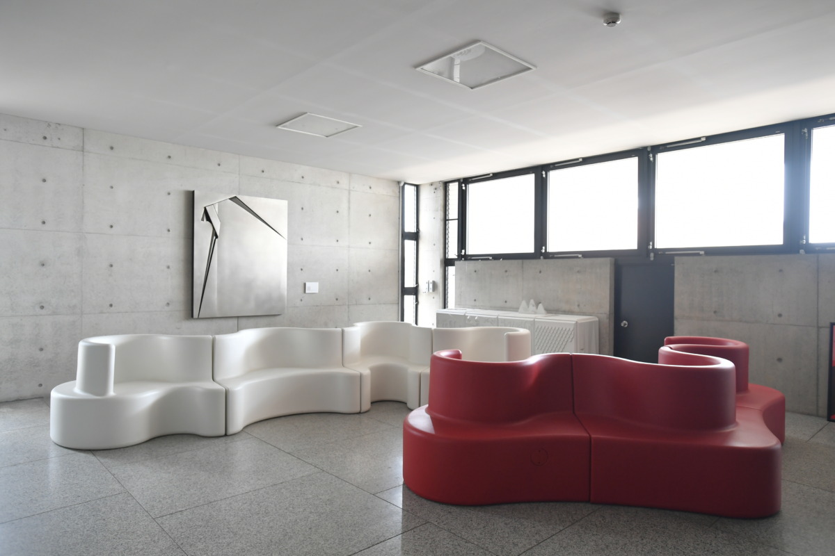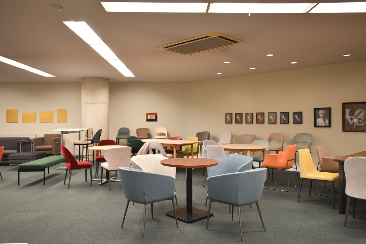 本社一階、受付前には世界的デザイナー、ロン・アラッド氏の作品、全長3m弱の「ビクトリア・ソファ」が鎮座。奥のスペースには、北欧フィンランドのデザイナー、エーロ・アーロニオ氏が手掛けた「ポニー」、「パステルチェア」、「バブルチェア」などが並ぶ。