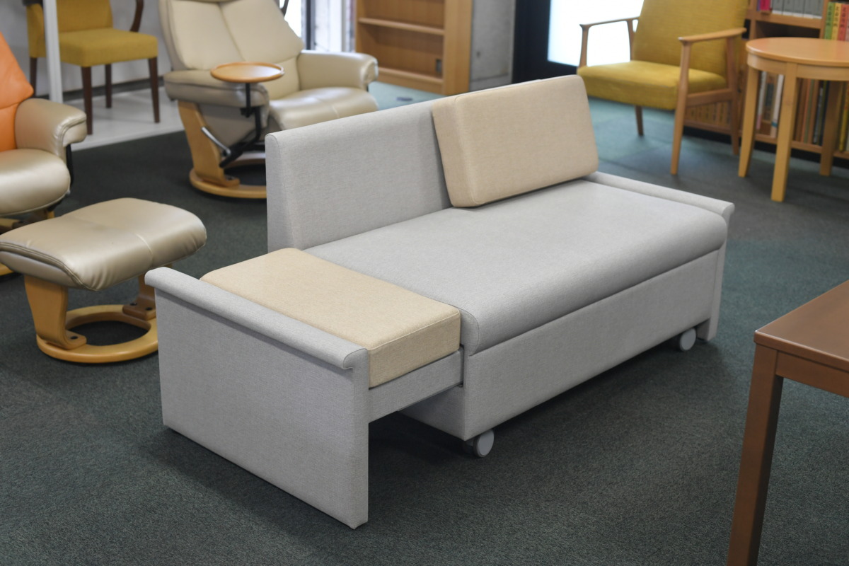 ここではブランドを象徴する代表的な製品を紹介したい。下の写真「スリーパーソファー+」は、医療施設の待合室や病室の設置を考慮した製品。一見は小ぶりな二人掛けソファーだが、実は両サイドがエクステンション式になっており、背もたれのクッションを差し込むことでフラットになり、緊急時に臥床したり、入院患者の付き添い人が仮眠を取れるベッドとして使い分けることが可能だ。