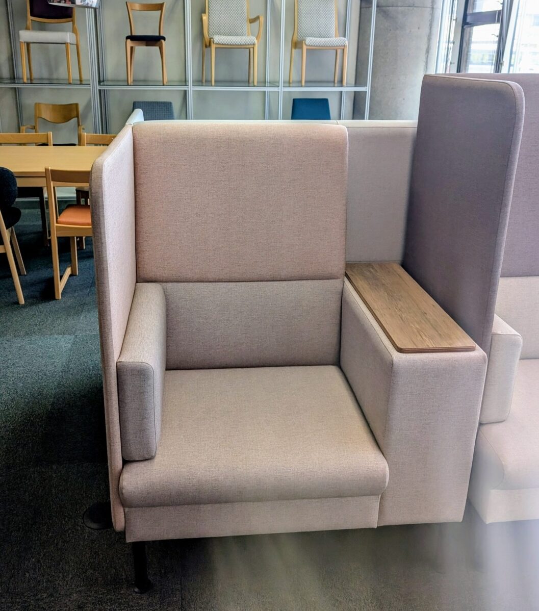 「オアシス」シリーズは、病院の待合室に設置することを考慮した製品。一般に小規模な病院の椅子として想像するものは、多人数が一度に座れる長いソファなどだが、一名分空けて着座するソーシャルディスタンスが叫ばれたパンデミック以降、距離を離してセパレートできる一人掛けタイプやパーテーションのあるタイプが求められているという。またサイドのパネルの高さは患者の気配が感じられる(頭が見える)高さのものが複数用意されているという。