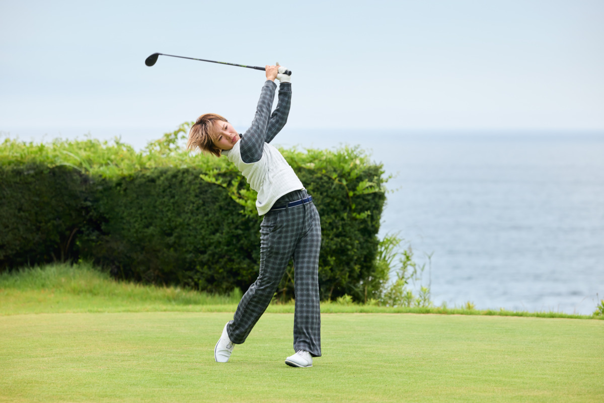 夫婦水入らずのリゾートゴルフを楽しみながらも、時折見せるターゲットに集中する表情は、ツアーを戦うプロゴルファーそのもの。