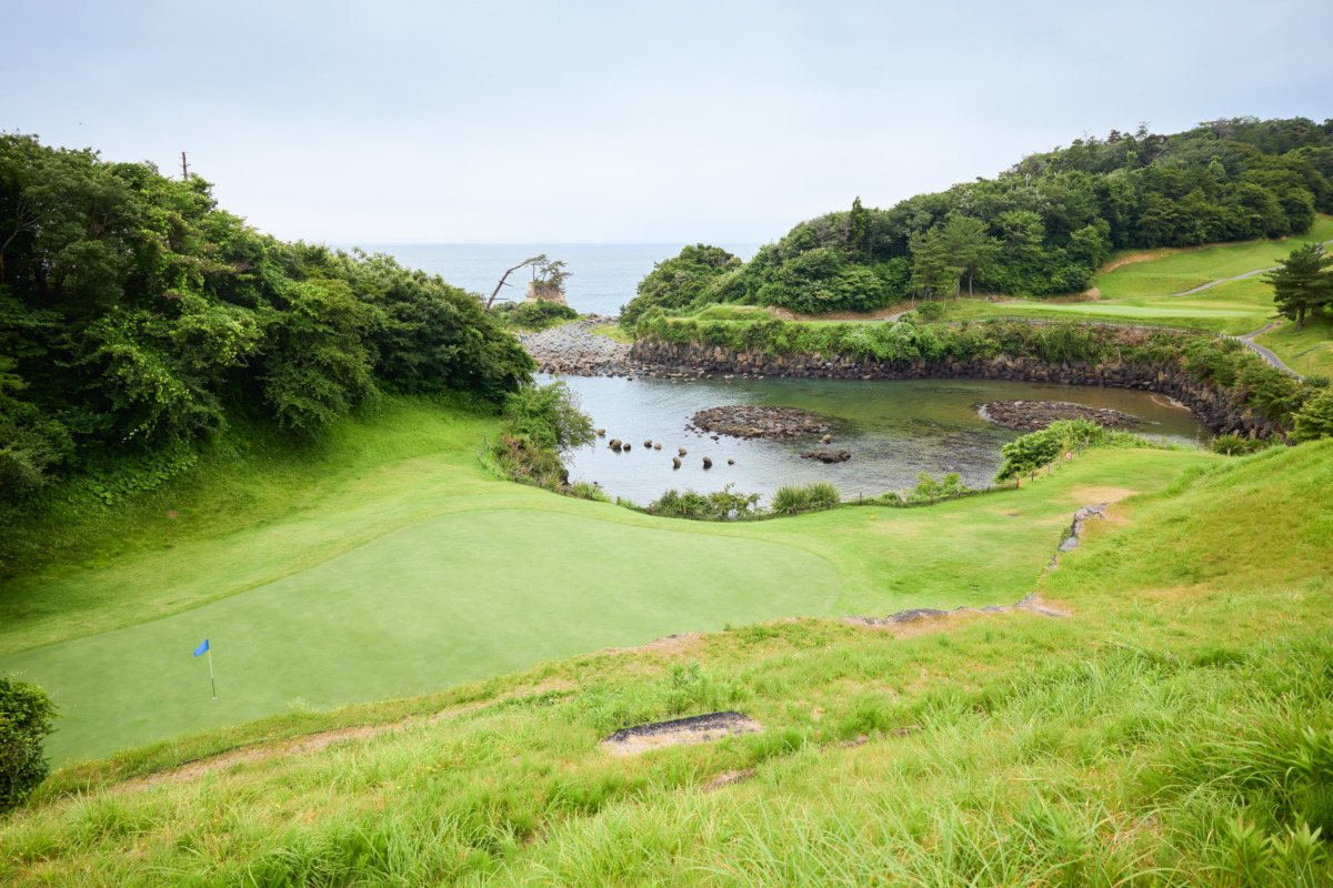 シーサイドコースならではの海越えにチャレンジする16番ショートホール。