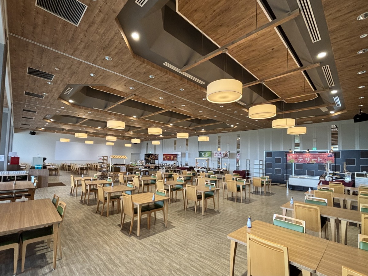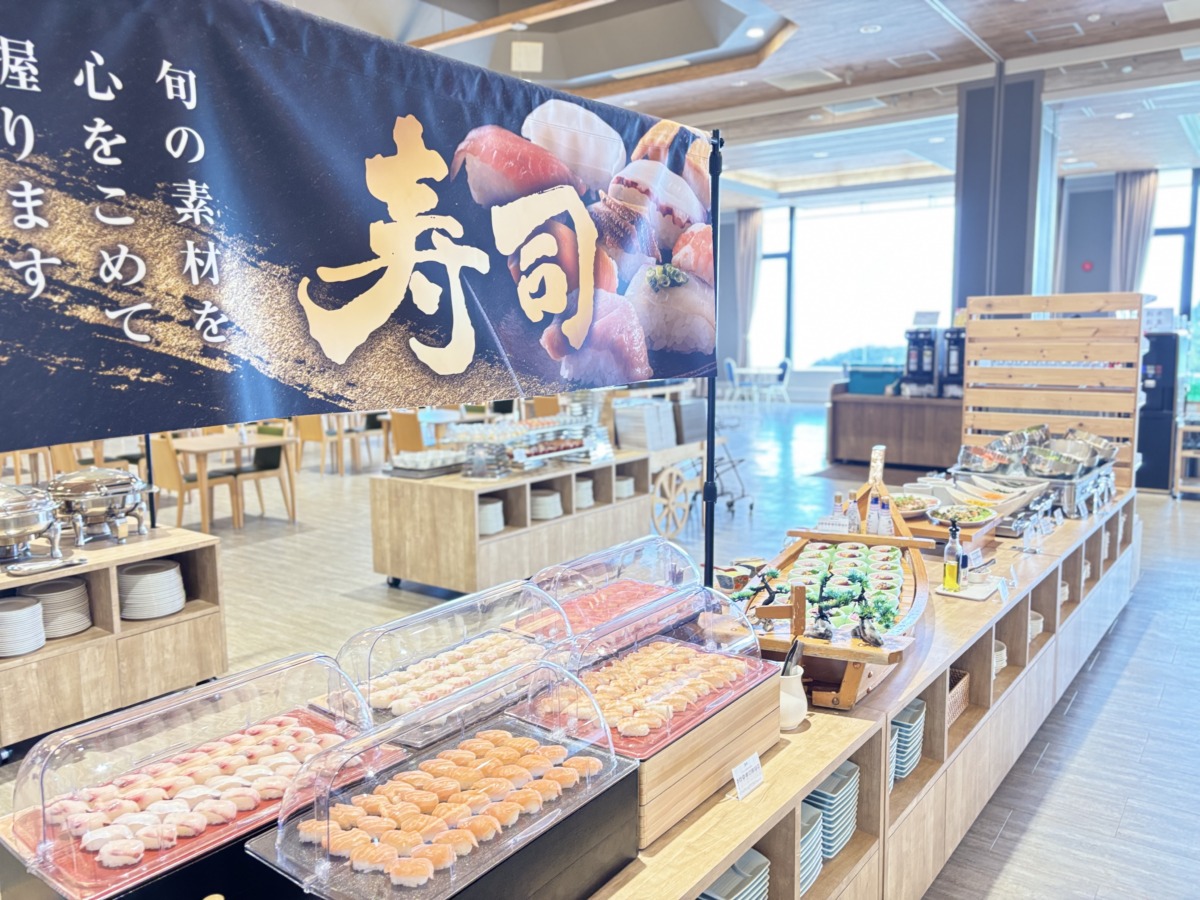 夕食会場として利用するのは「ホテルレストラン サンライズ」。季節ごとに移り変わる緑と壮大な空を背景にした解放感のある空間で、90分間飲み放題・食べ放題のディナーバイキングが楽しめる。