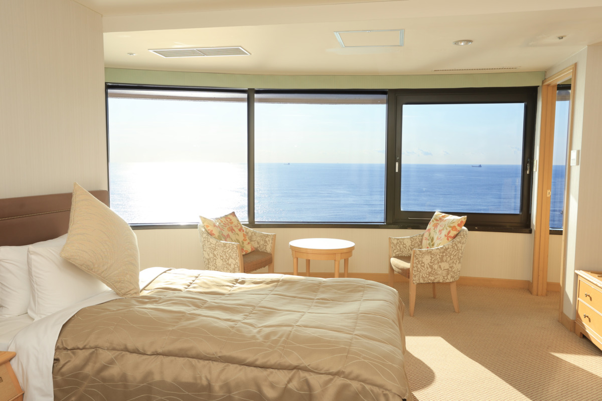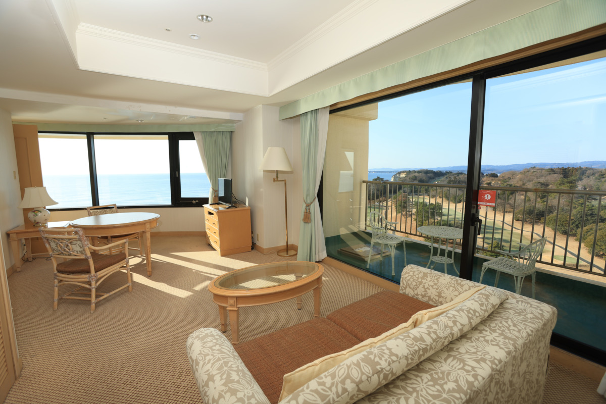 客室は全室バルコニーを備え、眼下に広がる太平洋とゴルフコースの眺望を楽しむことができる。リビングとベッドルームが独立し、バスルームからも海が臨める90㎡のスイートルーム、60㎡の広さを誇るセミスイート、解放感に溢れたツインルーム、お得にリゾートステイが可能なコンパクトツインルーム、ゆったりとくつろげるシングルルーム、日本の風情を生かした和室の全6タイプの客室が用意される。