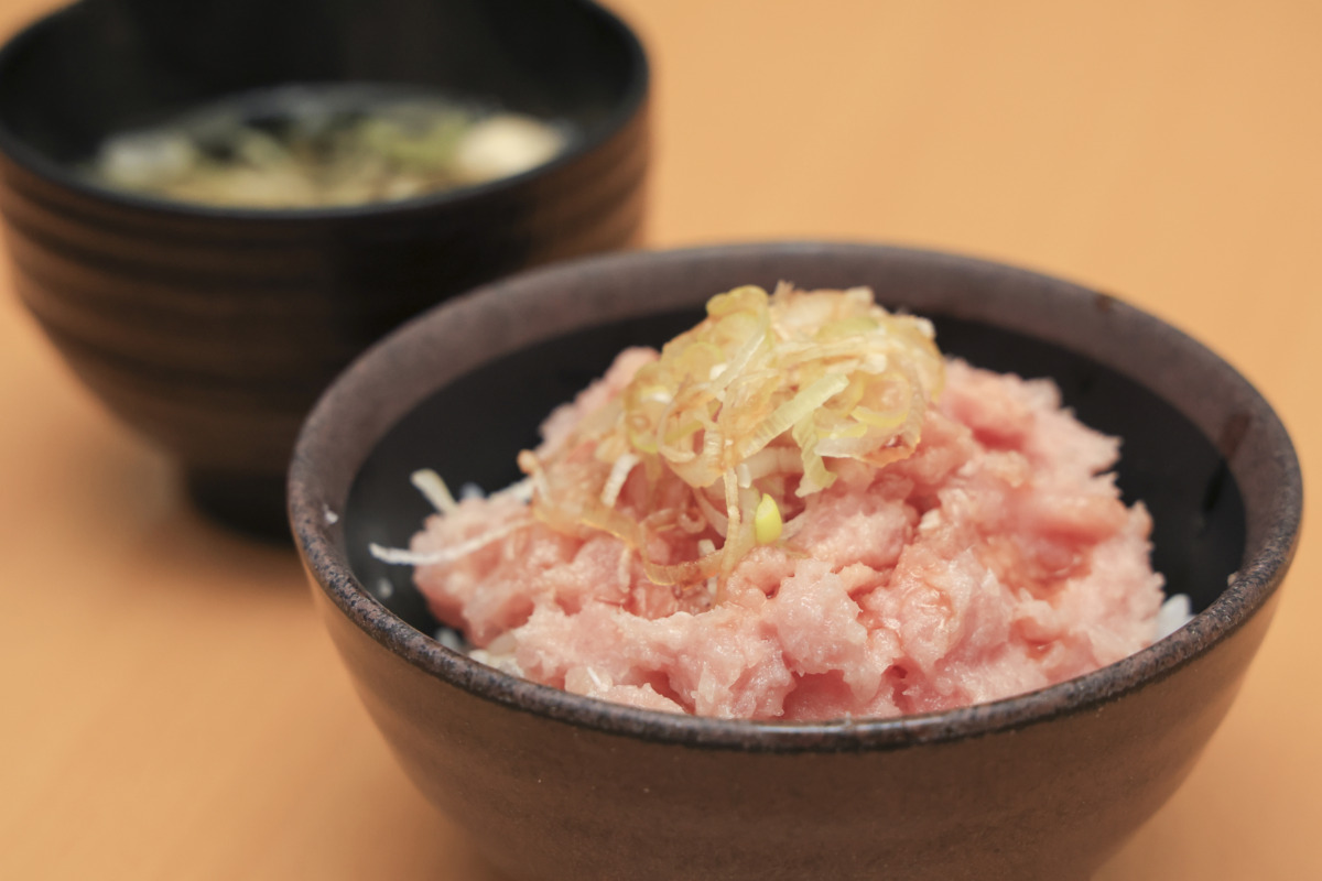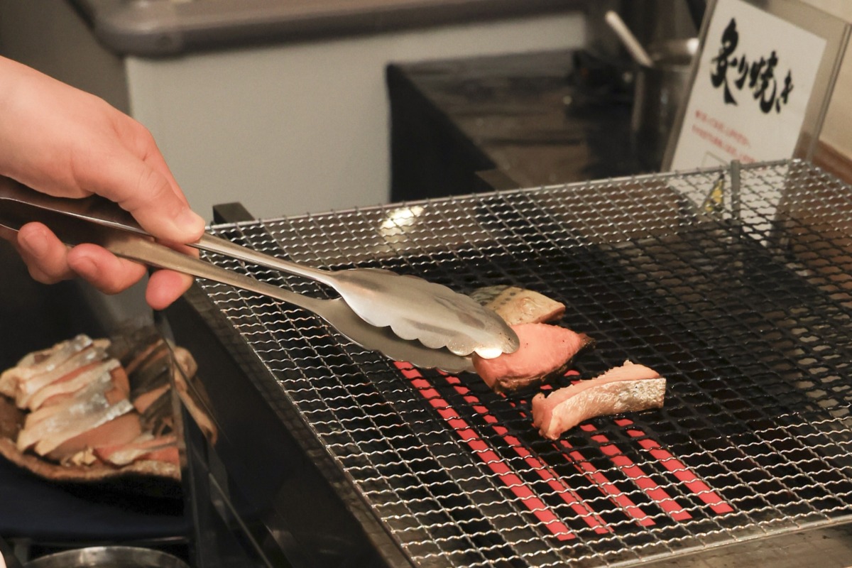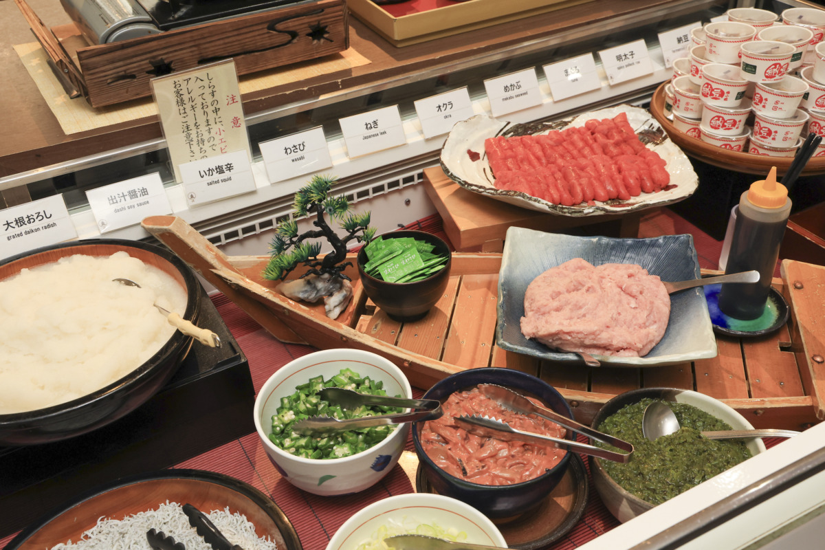 和洋中の豊富なメニューがそろう朝食バイキング。前日、ついつい飲みすぎ食べすぎてしまった宿泊客から人気なのが、新鮮な海の幸を選んで自分好みにカスタマイズする「小どんぶり」。