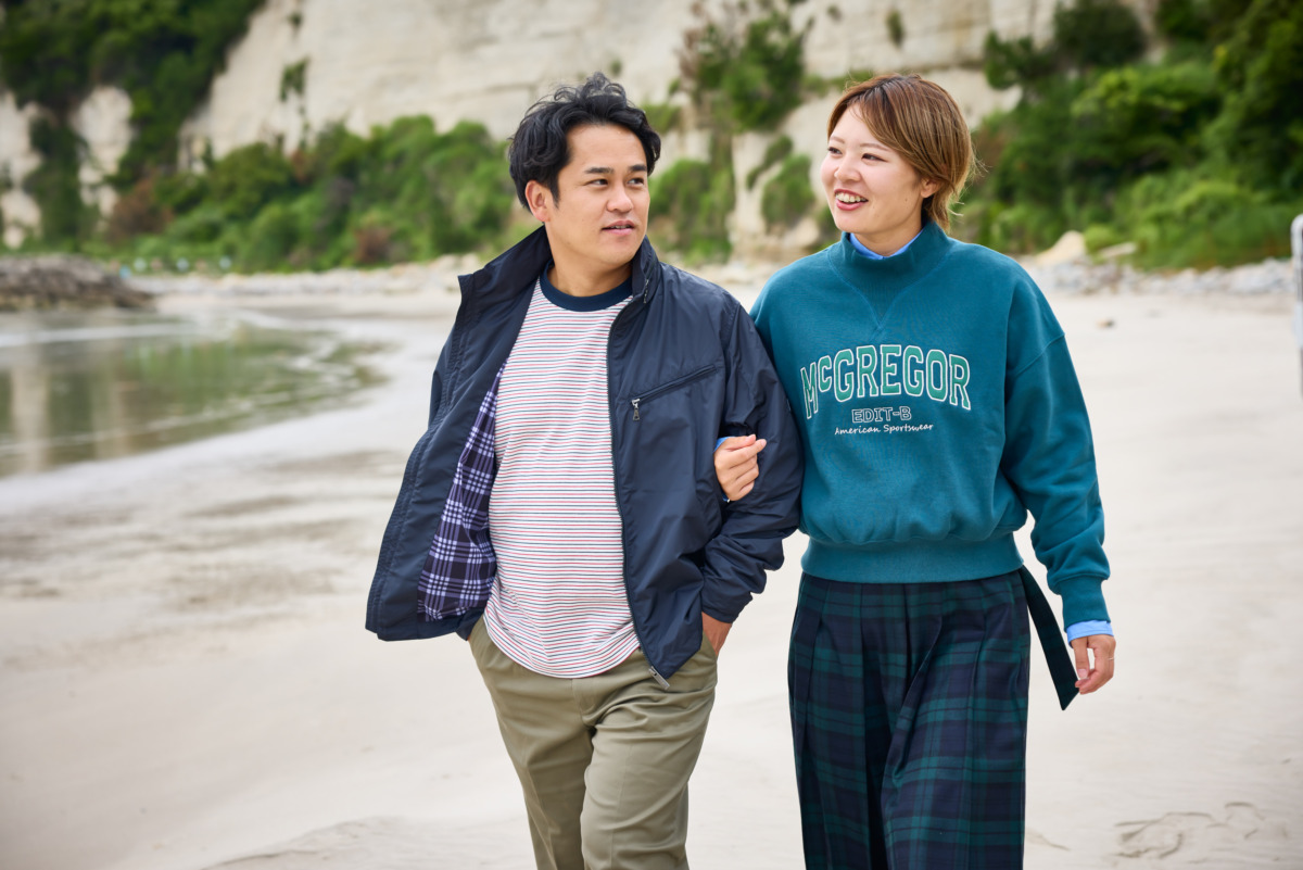 カジュアルながら品のある大人の着こなしがキマる「マックレガー」の秋コーデで散策を楽しむ二人。貴重な休日を心から楽しみ尽くして一路帰路についた。