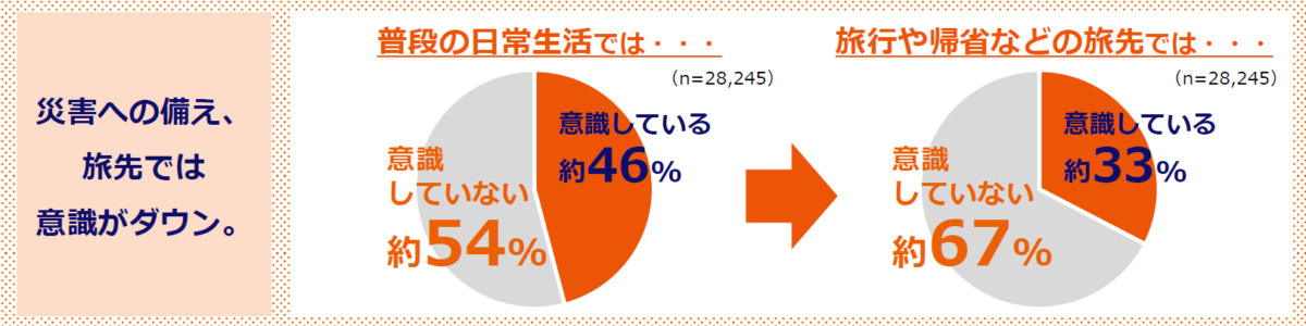 auが行った調査によると、旅行や帰省の際に防災を意識している人は約3割(32.6%)に留まり、被災経験者の4割以上(42.9%)が「旅先で災害時にスマホが使えなくなった」と回答しています。困りごとの上位には「充電切れ」「圏外・電波が不安定」といったスマホ関連が並びます。